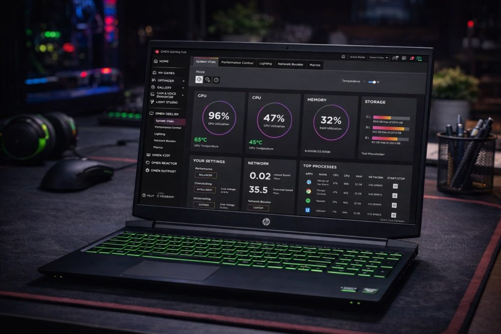 Попередньо встановлене застосування HP Omen Gaming Hub об’єднує всі інструменти для оптимізації ігрового досвіду в єдиному інтерфейсі. Користувачі можуть моніторити температуру компонентів у реальному часі, відстежувати завантаження процесора та відеокарти, налаштовувати профілі продуктивності для різних сценаріїв використання. Функція Network Booster пріоритизує ігровий трафік над фоновими оновленнями, зменшуючи затримки під час онлайн-сесій.