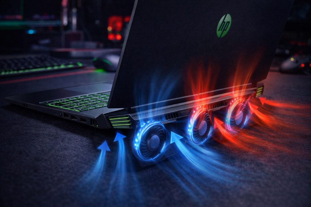 Інженери HP розробили спеціальну архітектуру вентиляції з двома кулерами та трьома тепловими трубками, які відводять нагрітість від процесора й відеокарти. Широкі вентиляційні отвори розташовані на задній та бічній панелях корпусу, забезпечуючи постійну циркуляцію повітря навіть під час тривалих ігрових сесій. Утиліта HP Omen Gaming Hub дозволяє регулювати швидкість обертання вентиляторів у трьох режимах – тихому, збалансованому та продуктивному.